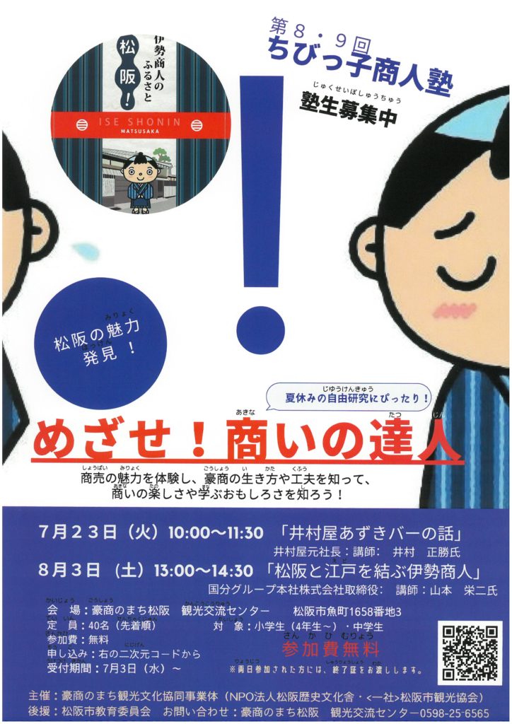 豪商の生き方や工夫を学び、商いの楽しさや学ぶおもしろさを知ろう。 両日参加すると修了証がもらえるよ!